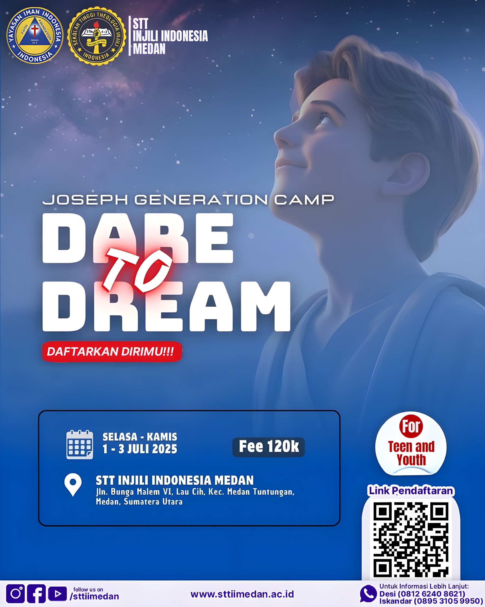 "Dare to Dream, Dare to Achieve!" Joseph Generation Camp 2025, tempat kamu menemukan impianmu! Tanggal: 1-3 Juli 2025 Tempat: STTII Medan Kontribusi: Rp120.000 Daftar sekarang juga melalui link: https://forms.gle/RssBQFGEr87mPRz49 #JGC2025 #DareToDream #JosephGenerationCamp