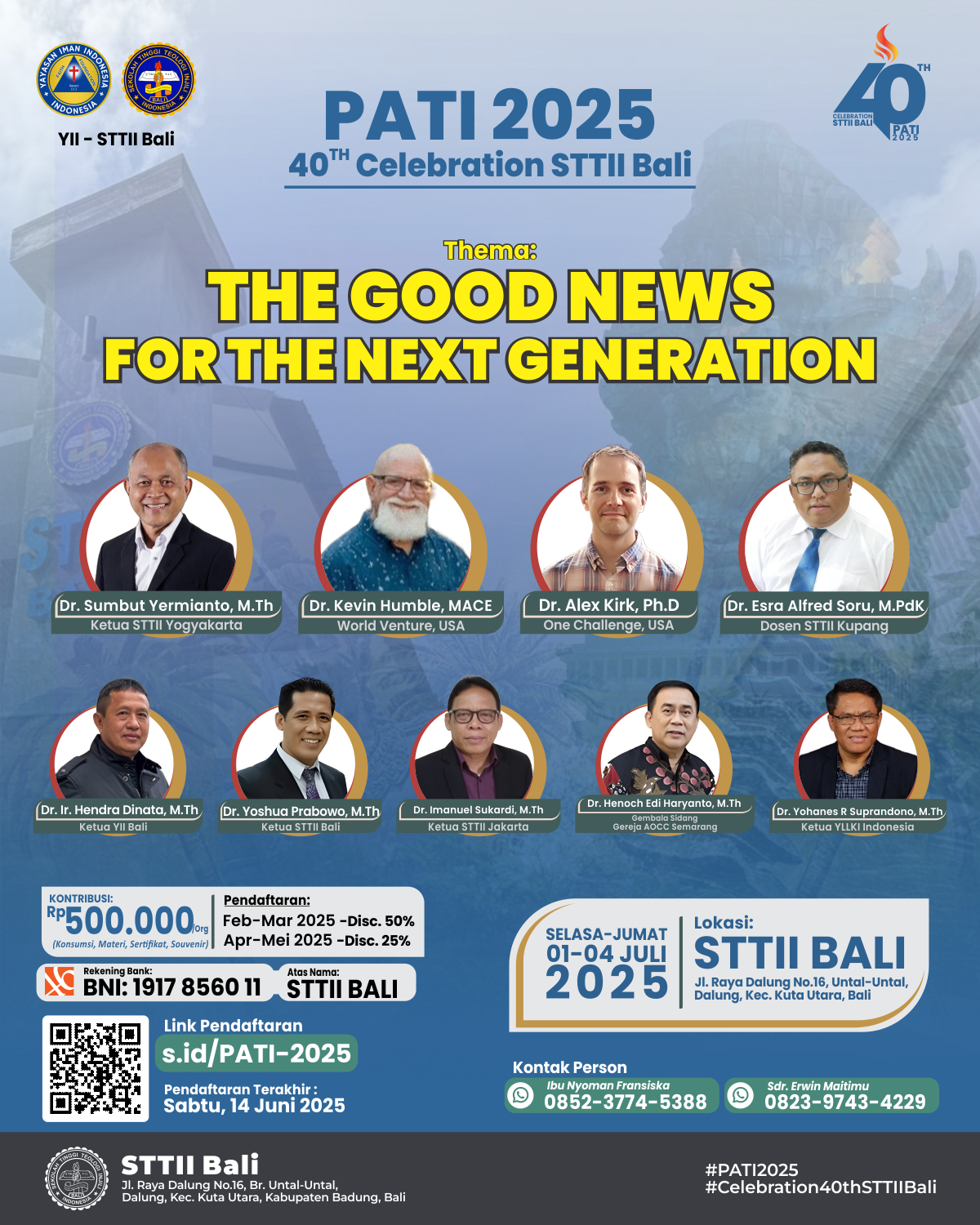 Penyegaran Abdi Tuhan Indonesia (PATI) tahun 2025 dan Celebration 40 tahun Sekolah Tinggi Teologi Injili Indonesia Bali. STTII Bali dengan bangga mengundang bpk/ibu/sdr/i untuk bergabung dalam perayaan istimewa PATI 2025 dan memperingati 40 tahun STTII Bali! Dengan tema "The Good News for the Next Generation," acara ini akan menjadi kesempatan yang luar biasa untuk belajar, berbagi, dan merayakan perjalanan kita bersama. PATI 2025 dan Celebration 40 tahun STTII Bali diselenggarakan pada tanggal: 01 sampai 04 Juli 2025, di Kampus STTII Bali yang beralamat di Jl. Raya Dalung No.16, Dalung, Kec. Kuta Utara, Kabupaten Badung, Bali. Narasumber: - Dr. Sumbut Yermiatno, M.Th. - Ketua STTII Yogyakarta - Dr. Kevin Humble, MACE - World Venture, USA - Dr. Alex Kirk, Ph.D - One Challenge, USA - Dr. Elora Alfred Soru, M.Pd.K - Dosen STTII Kupang - Dr. Ir. Hendra Dinata, M.Th. - Ketua YII Bali - Dr. Yoshua Prabowo, M.Th. - Ketua STTII Bali - Dr. Imanuel Sukardi, M.Th - Ketua STTII Jakarta - Dr. Henoch Edi Haryanto, M.Th - Gembala Sidang Gereja AOCC Semarang - Dr. Yohanes R. Suprandono, M.Th - Ketua YLLKI Indonesia Biaya Pendaftaran: - Pendaftaran (Feb-Mar 2025): Rp 250.000 - Pendaftaran (Apr-Mei 2025): Rp 375.000 Untuk informasi lebih lanjut dan pendaftaran, silakan kunjungi tautan berikut: (http://s.id/PATI-2025) Mari kita bersama-sama merayakan momen bersejarah ini dan menyebarkan kabar baik untuk generasi mendatang! Jangan lewatkan kesempatan berharga ini untuk mendapatkan wawasan dari para pemimpin dan praktisi terkemuka.