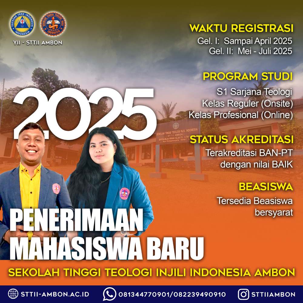 Sekolah Tinggi Teologi Injili Indonesia Ambon membuka kesempatan kepada siapa saja yang terpanggil dan mau diperlengkapi sebagai Hamba Tuhan bisa mendaftarkan diri ke STTII Ambon.